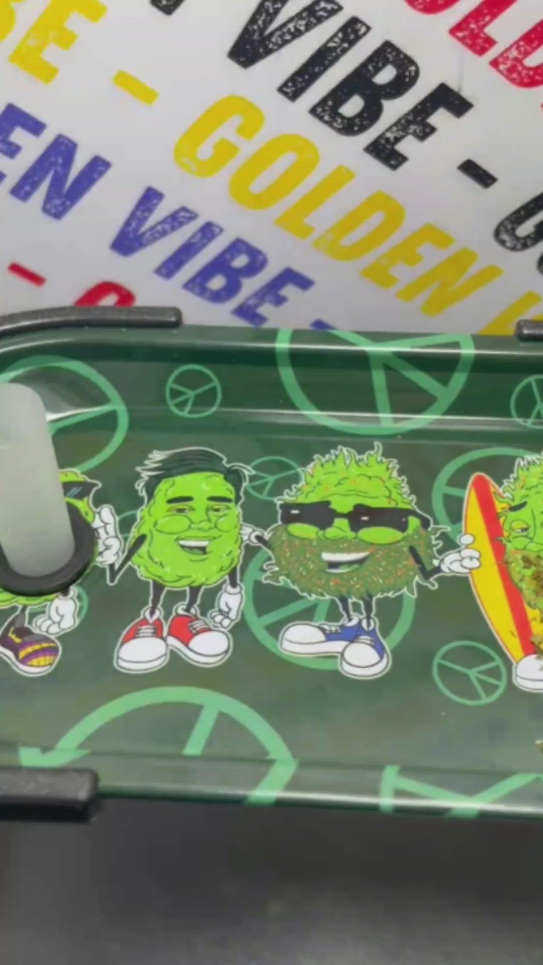 Le plateau est illustré avec des motifs buddies weeds, ajoutant une touche artistique à son usage. Le design présente des buds animés et d'autres éléments visuels saisissants, ce qui en fait non seulement un outil utile, mais aussi un objet décoratif.
